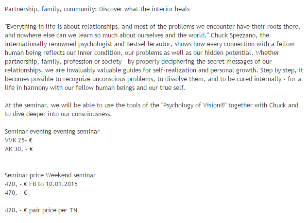 Here are the German and English versions of a 2015 advertisement falsely merchandising Chuck Spezzano as a "psychologist" (he is not) who is "internationally renowned."